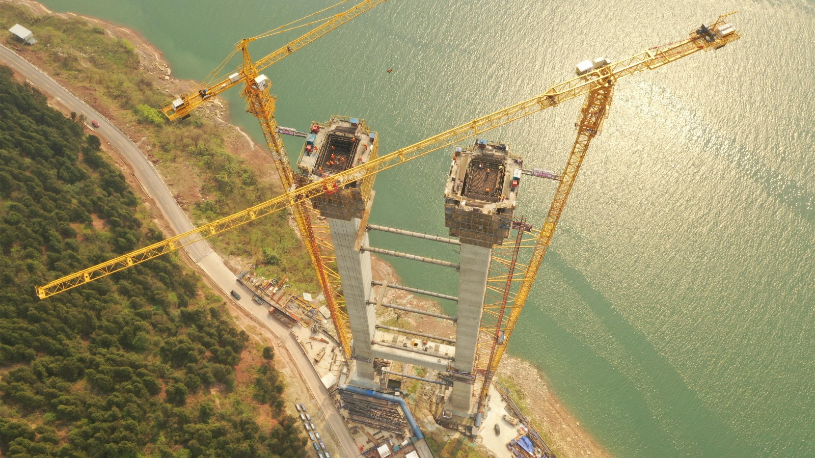 新田長江大橋是萬州環線高速公路項目關鍵控制性工程,大橋全長約1.7公里,主跨1020米,是三峽庫區在建跨度最大的雙塔單跨鋼箱梁懸索橋,大橋主塔采用門式框架結構,受地形限制,上、下游側索塔塔柱采用不等高設計,其左幅索塔總高177.5米,右幅索塔總高161.5米。左幅主塔劃分為30個節段,采用液壓爬模施工,單節混凝土澆筑高度達6米,本主塔在全線率先施工,并按既定節點目標高效完成主塔施工任務。目前,項目整體施工進度正按預定計劃快速推進,右幅主塔預計3月底完成封頂。